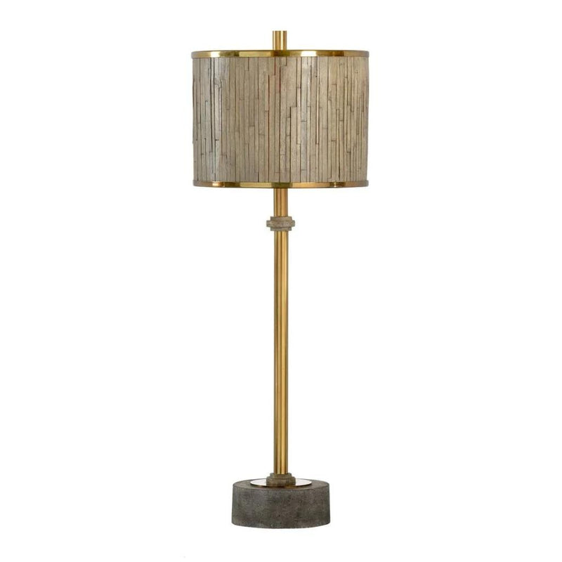 Enhance your living space with the beautifully crafted Currituck Table Lamp. Featuring a sturdy iron frame with an antique brass finish, this lamp exudes a classic charm that complements various decor styles. Its unique shade, made from wood strips finished in a driftwood style, adds a natural and rustic touch to any room. The lamp's gold and Grey color scheme offers versatility and easily matches with different color palettes. Designed with both style and durability in mind, the lamp stands on a circular Grey stone base for stability and has a slender gold stand for a touch of sophistication. The beige cylindrical shade diffuses light softly, creating a warm and inviting atmosphere.