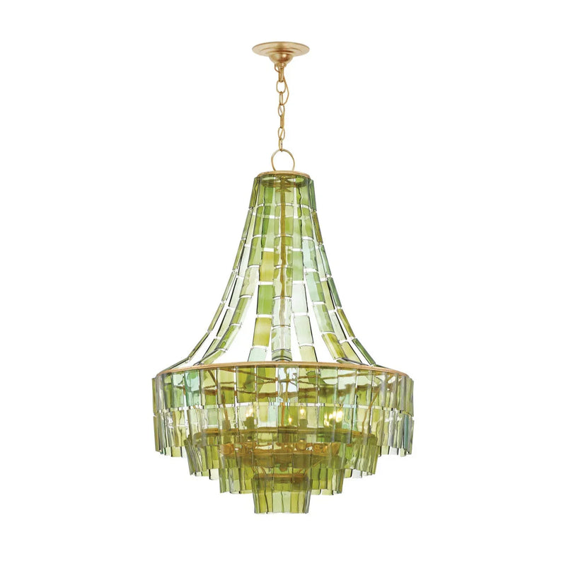 Cascading from the circular frames of our Vintner Chandelier are individually-cut pieces of green glass made from recycled bottles. The texture created by the varying hues of the glass beautifully complements the dark contemporary gold leaf finish on the wrought iron frame. Adjustable from 45.5" to 114.5" with use of included chain/rod kit/cable. If your space calls for a longer drop, additional chain/rods/cable is available for purchase.