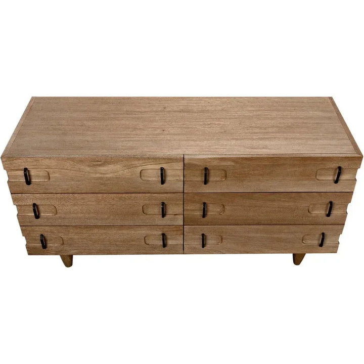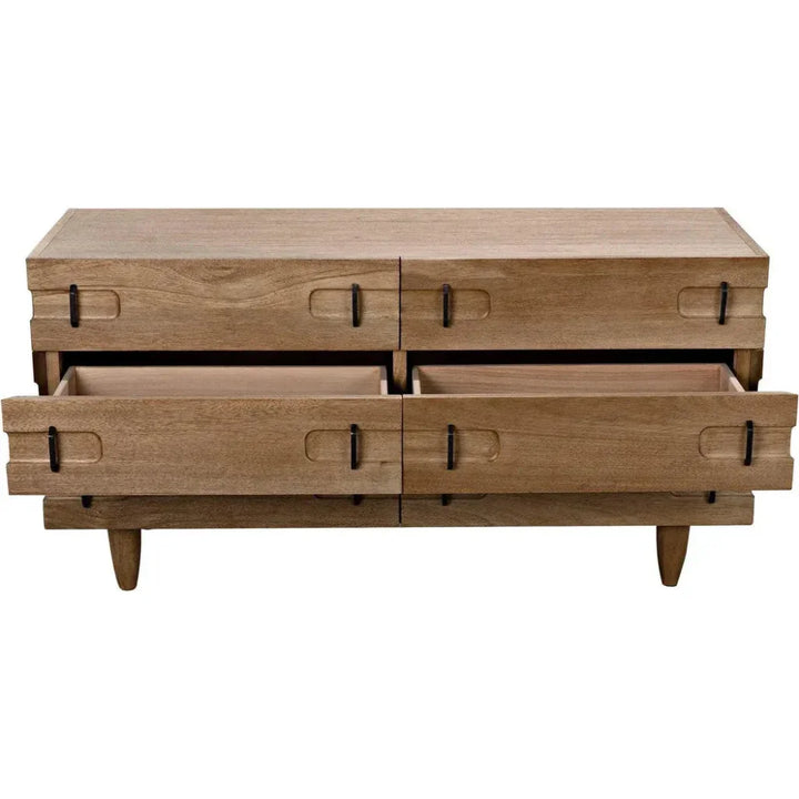 The David Dresser is a blend of rustic charm and refined craftsmanship, available in washed walnut or dark walnut finishes. Both variations are crafted from solid wood and offer a sturdy frame with tapered legs and simple yet sophisticated design details. Ideal for organizing and displaying your essentials, this dresser features ample storage while adding a stylish presence to any room. The washed walnut version highlights natural grain with a lighter tone, while the dark walnut version leans into a richer brown hue with a rustic feel. Handcrafted elements make each piece unique, showcasing slight variations in dimension, finish, and distress that do not impact structural integrity.
