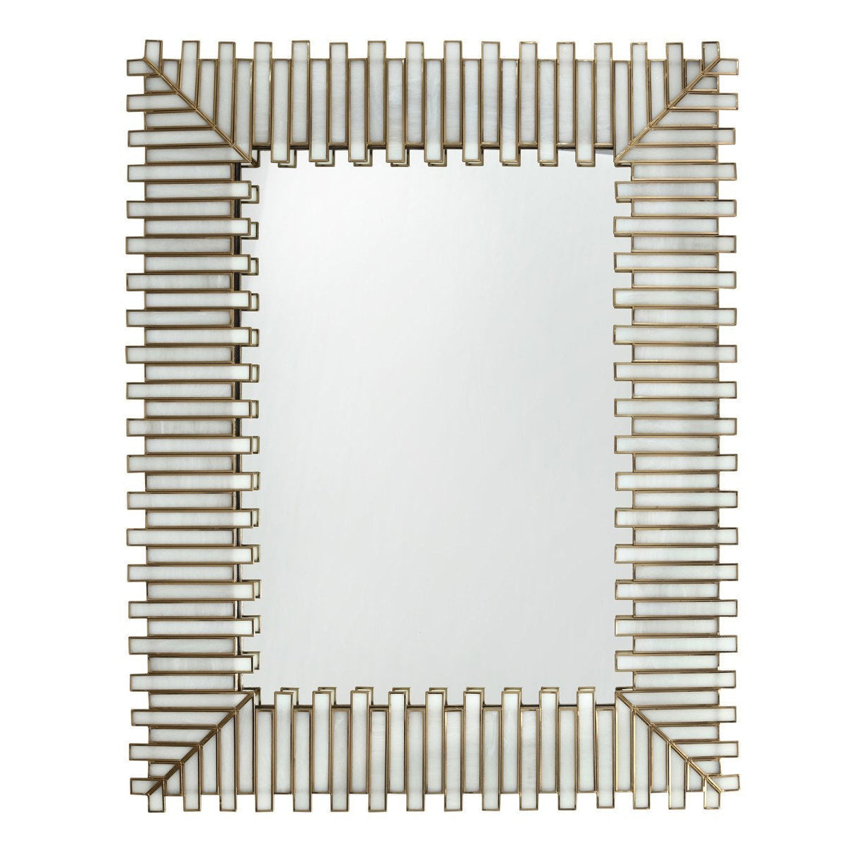 The Daze Rectangular Mirror has a frame made of pieces of milk glass that are joined together by ribs of metal in an antique brass finish. This white decorative mirror with its contemporary profile provides a soft, luminous glow when illumination strikes it. When seen at an angle, the sections of the mirror that float below the frame have twin reflections. Because it is made of an artisanal material, its surface may vary slightly from mirror to mirror.