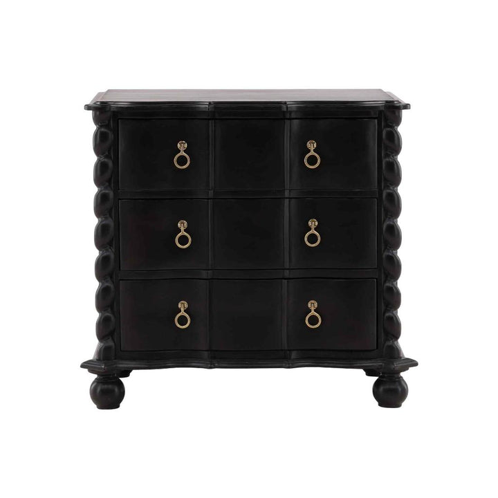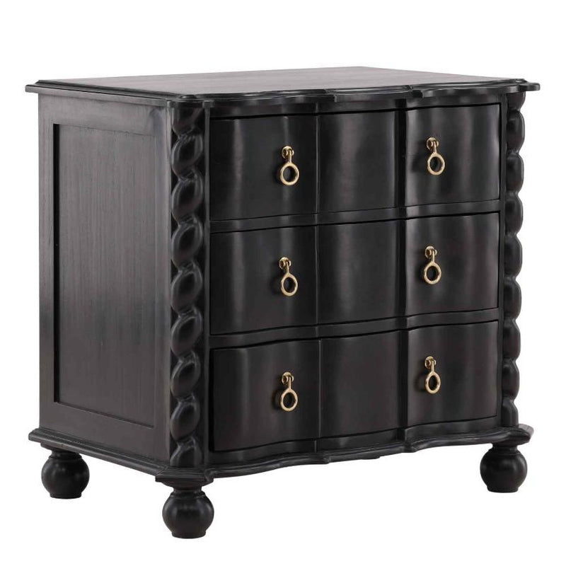 The Deeds Chest brings together fine craftsmanship, eco-friendly materials, and a touch of elegance. Made from sustainably grown mahogany, it boasts a hand-applied black finish that enhances the wood's natural beauty while adding a dramatic flair to any room. Its intricate twisted edges and brass hardware provide a timeless, refined look. This chest isn't just about looks; it's also highly functional, offering ample storage for any bedroom, living room, or hallway. The Deeds Chest is a perfect blend of style and utility, showcasing both luxury and a commitment to sustainability.