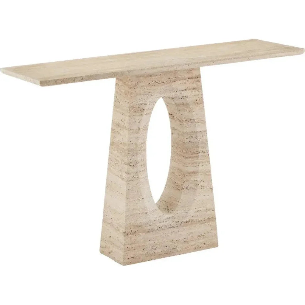 The Demi Travertine Console Table is made of solid travertine. A bevel softens the oval that is carved into the stone on both sides of its pedestal to infuse the tan console table with sophistication, as the cut-out forms an oculus. The way the pedestal tapers to a smaller form toward the top is a shapely design move, as is the chamfered detail under the top. This table has a dynamic personality thanks to the veining in the stone, which means each one will be unique.