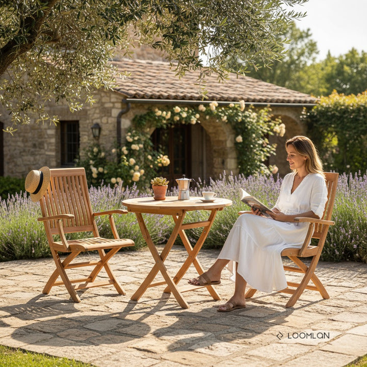 Devon 3-Piece Teak Bistro Set With Folding Chairs Features: