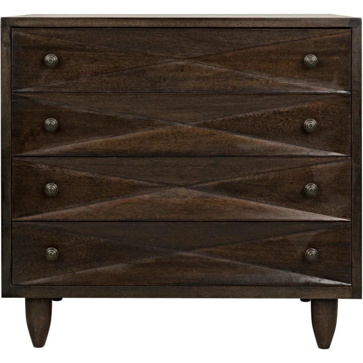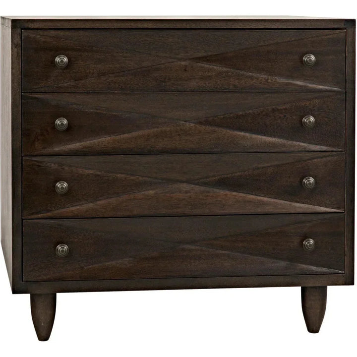 Refined and visually striking, the Diamond Wood Walnut Chests bring a blend of elegance and utility to any space. Featuring elaborate diamond-shaped carvings, these expertly designed pieces are enhanced with sleek metal pulls and peg legs for a modern yet timeless aesthetic. Whether in dark walnut, washed walnut, or ebony walnut finishes, each chest showcases its unique color tone while maintaining the same artistic structure and thoughtful design. The natural, washed, or ebony tones complement the ornate carving detail, while the functional elements remain simple and understated, making these chests both practical and visually impactful for any room.
