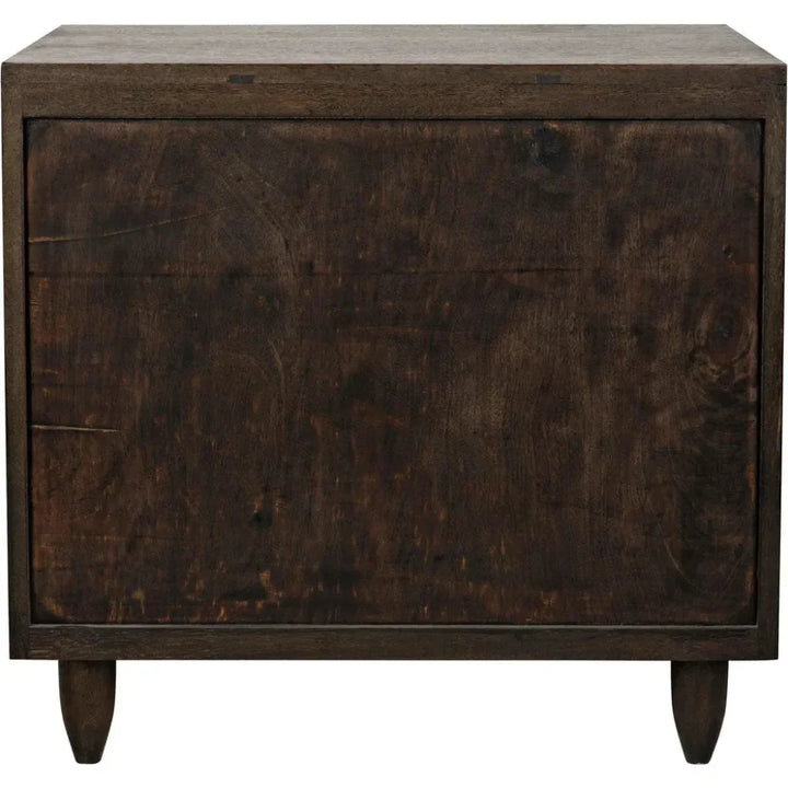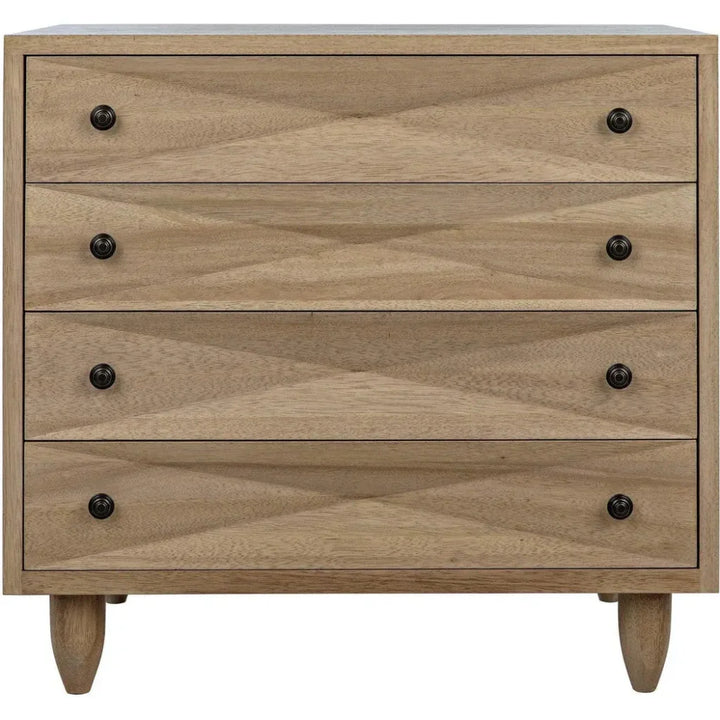 - Features intricate diamond-shaped carvings and modern metal pulls with peg legs