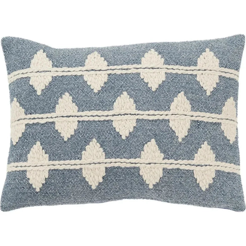 This knife pillow is woven using yarn dyed yarns in two colors. When woven together, they create a heathered look. Chunky yarn cords are machine applied over the top of the weaving creating diamond shapes along a horizontal stripe. The back of this pillow is a solid coordinating cotton back with a hidden zippered closure. Give your room a makeover with this pop of color accent pillow from Rizzy Home. Perfect for both modern craft and industrial-chic styles, this 14" x 20" woven accent pillow is crafted with 100% cotton, and epitomizes a traditional style blended with modern flair. The intricate diamond stripe pattern on the yarn dyed woven base is adorned with chunky applied cotton chord embroidery, giving it a unique, industrial feel, set into a stripe for edgy texture and visual appeal. The coordinating solid back features a hidden zipper closure for ease of fill and a clean finish. The soft colorway of indigo blue and ivory builds a serene and stylish accent of both color and dimension that will elevate the style in any cozy living space in your home.