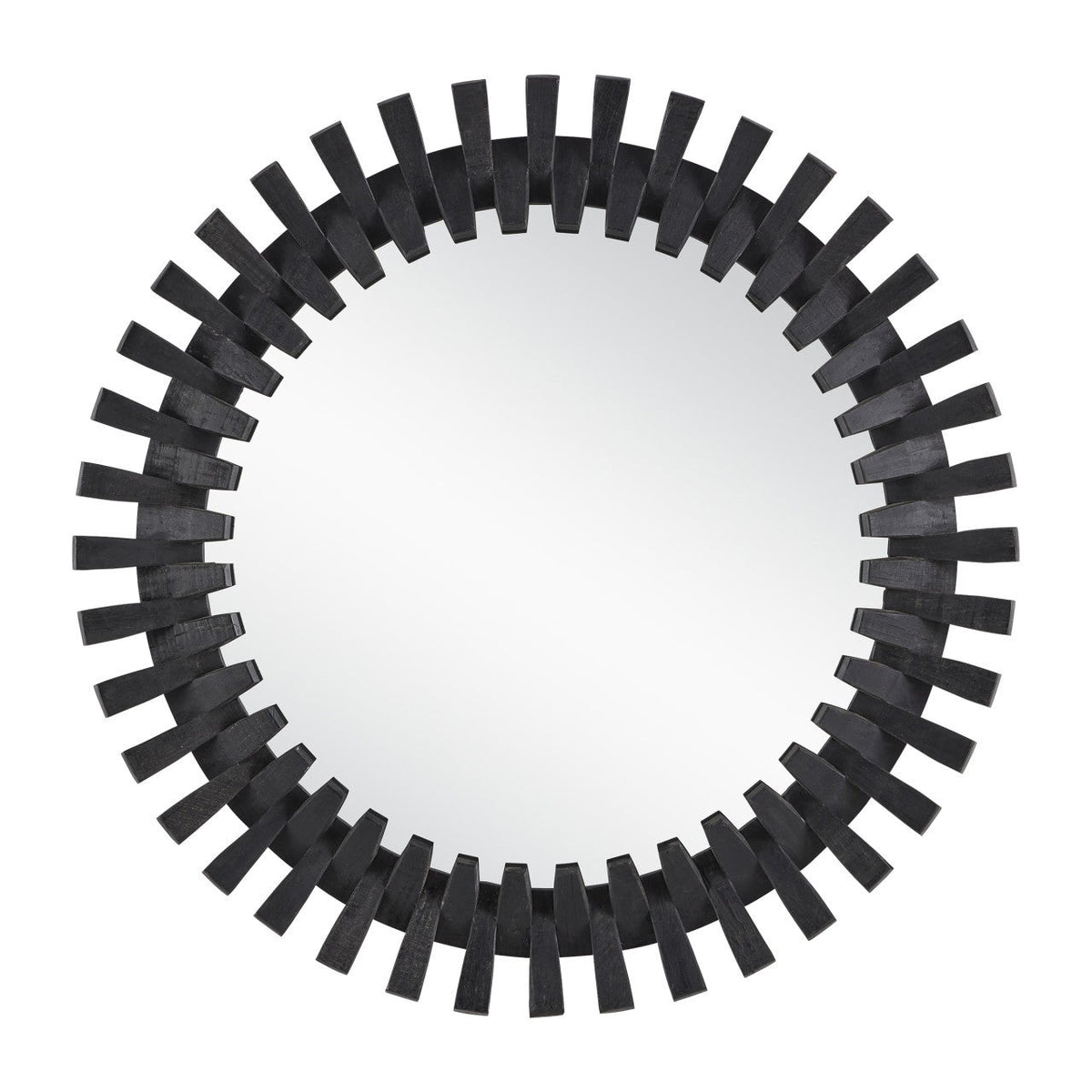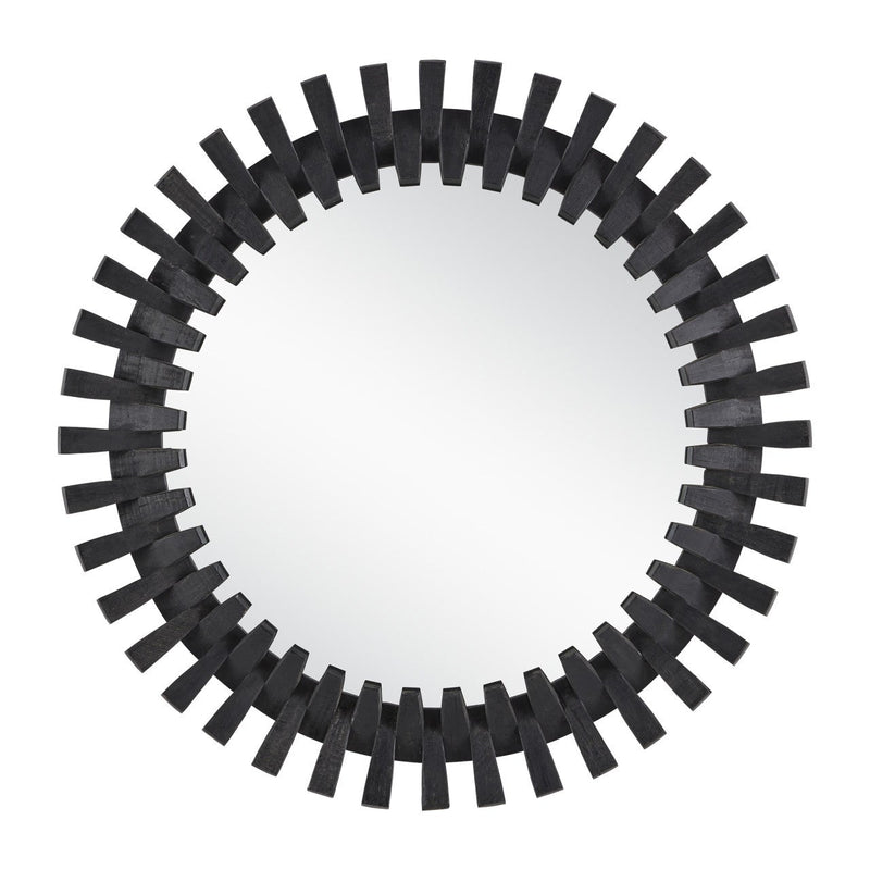 The Diza Round Wall Mirror has a profile that is just as interesting from the side as it is from the front. This is because the wood pieces, which taper and are fitted in by hand, splay outward on both the exterior and the interior of the wall mirror. The depth this creates will make the decorative mirror a commanding element in a space. Both the very subtle crackle effect created by the woodgrain and the shape are textural details.