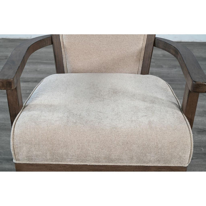 - Upholstered in beige fabric