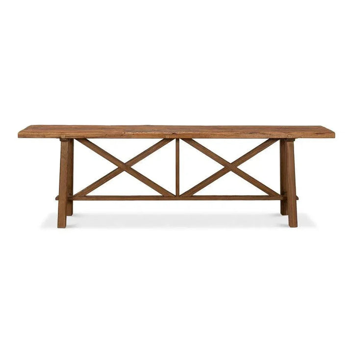 Its solid wood top boasts a beautifully weathered finish, while the impressive undermount cross design adds dramatic and sturdy support. Naturally occurring imperfections, such as nail holes and splits, are evident, showcasing the wood's previous life. As each piece is handmade, you'll enjoy a truly distinct and conversation-worthy addition to your space.