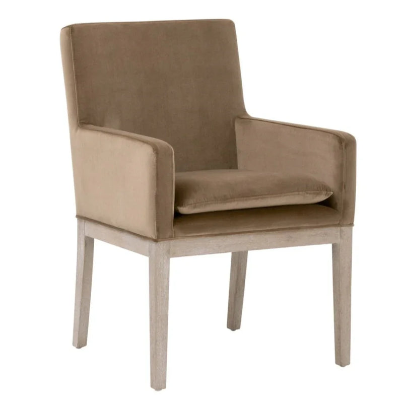Made of smooth and luxurious velvet, the Drake Arm Chair by Essentials For Living is both rich in color and versatile in function. The plush seat cushion is thoughtfully attached to the chair and features elegant knife edging. Filled with high-density foam, the cushion offers a comfortable seating experience. The solid wood base, crafted from solid oak with natural gray undertones, complements the caramel velvet beautifully. This chair fits seamlessly into various settings, whether it's used as a dining chair, accent chair, or desk chair. The Drake Arm Chair stands out with its transitional style and appealing tones. It brings an ultra-cozy seat to any dining or living space, making it a great fit for homes looking to add a touch of elegance.