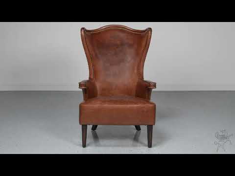 Constructed by skilled artisans using high-quality wood and soft leather, the Drake Distilled Leather Accent Chair Tall Back exudes luxury and sophistication. The tall back and spacious seating offer a refined experience, complemented by the elegance of the antique brass nailhead trim. This chair in brown is a perfect choice for relaxation or impressing guests with its style. The Drake Distilled Leather Chair features a strong wood frame and brown leather upholstery adorned with antique brass nailhead trim, showcasing a blend of quality and luxury.