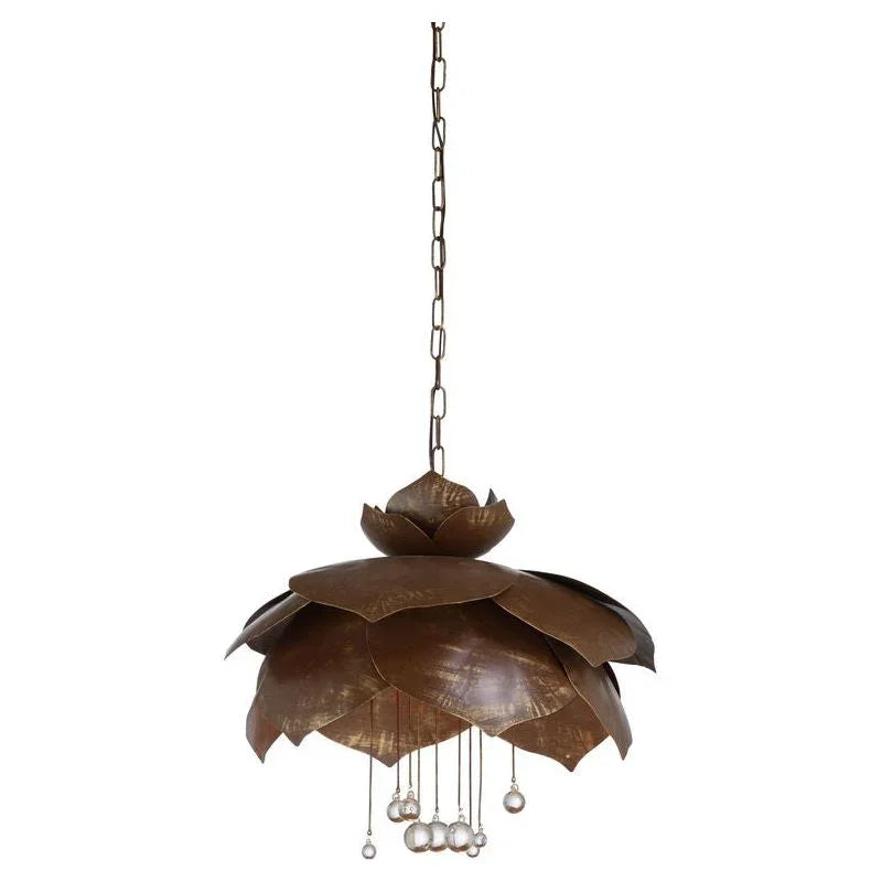 Elevate any room with a touch of elegance using this pendant light. The Wildwood Droplet Pendant With Crystal Teardrops combines a rustic and refined look, making it a great choice for those who appreciate a mix of natural and polished styles. Featuring a brown finish with gold highlights, this pendant creates a warm glow that enhances any space. The flower petal design adds a unique charm, while the clear crystal teardrops catch and reflect the light beautifully, adding a luxurious touch. This pendant is not just a light fixture; it is a statement piece. It comes with a six-foot chain, allowing for versatile placement options.
