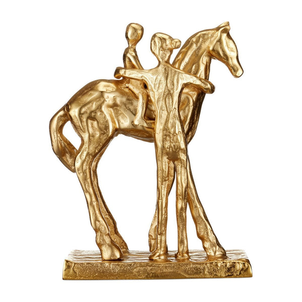The Dujardin Equestrian Sculpture is a stunning piece of art that captures a touching scene between a mother and her child, who is riding a horse for the first time. Made from cast aluminum, it boasts a brilliant gold finish that adds a touch of elegance to any setting. The sculpture’s abstract and surrealistic lines gently suggest the figures, creating a sense of motion and emotion. This piece is not just a sculpture but a narrative of love and support, making it a heartfelt addition to your home or office décor.