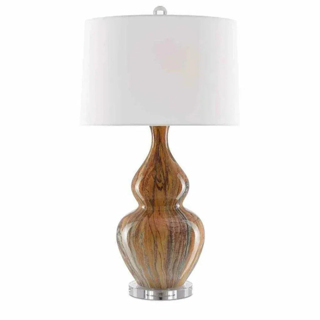 Elevate your living space with our exquisite and exclusive Earth Brown Kolor Brown Table Lamp. Crafted with a voluptuous gourd shape and adorned with a playful brushstroke pattern, this lamp exudes sophistication and luxury. The rich, earthy brown hue, paired with an optic crystal base and finial, creates an opulent ambiance. Available in a navy blue version as well, this lamp is the perfect addition to any upscale oasis.