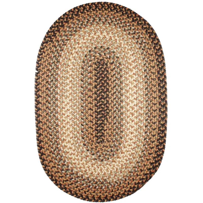 Classic racetrack pattern in natural earth tones combines tradition with the subtle look of tweed. Designed to be used indoors or out, this family-friendly rug is especially suited to high-traffic areas. Constructed of softly textured polypropylene cover yarns that stand up to the demands of sun, rain and dirt, with crush-resistant knitted filling that provides cushiony support. Because water drains right through the fibers, the rug dries quickly and is impervious to mold and mildew. To clean, just hose off and allow to dry in the sun.