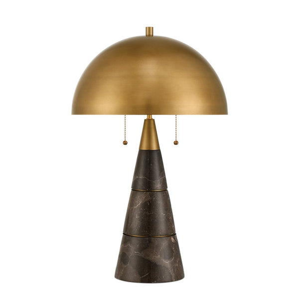 The Edith Desk Lamp is an all-metal design inspired by Mid-Century modern lighting. Its domed shade, finished in antique brass, is paired with a stacked column of three tapering coffee-brown marble pieces that telescope upward toward the shade. Slim brass rings separate each marble section, and a matching metal collar tops the column, tying the elements together with a refined, modern edge. Because it features a natural material, the surfaces of the stone may vary slightly from lamp to lamp.