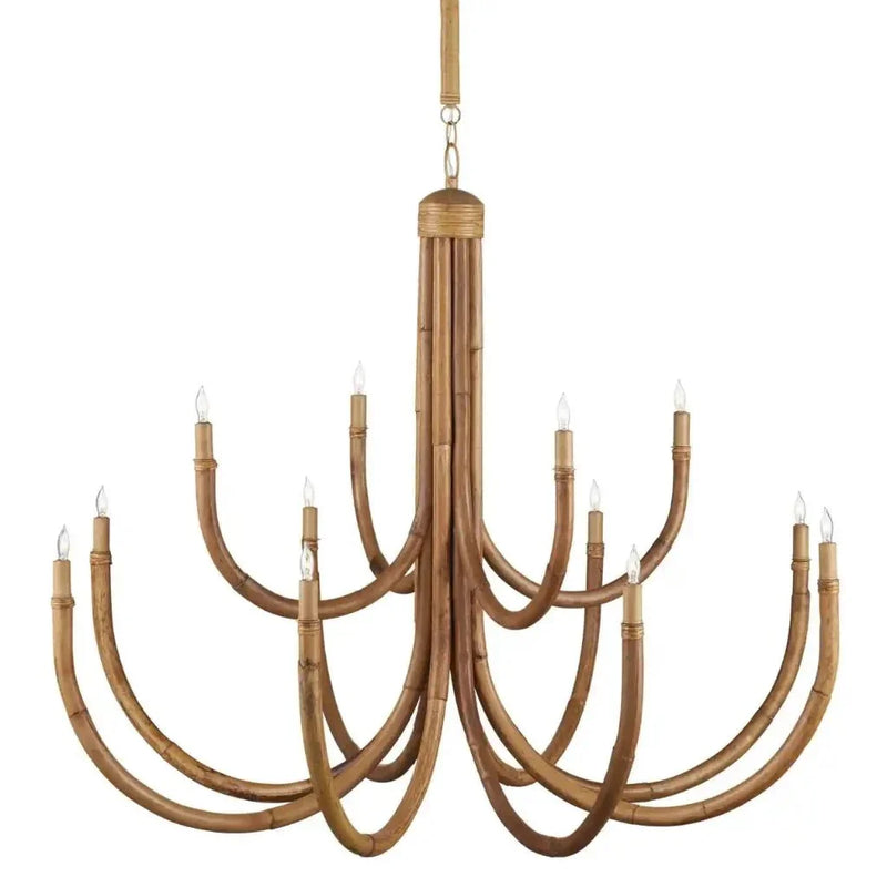 The Samsara Large Chandelier brings a touch of nature indoors with its elegant design. This chandelier is crafted from thick rattan reeds, showcasing expert craftsmanship. The natural brown color blends with the saddle tan finish, creating a soft and warm look. The twelve arms of the chandelier hold candle-style bulbs, adding to its charm. This chandelier stands out in any space, especially in coastal settings, making your room feel inviting and stylish. With its smooth finish and contemporary style, it fits well with modern decor.