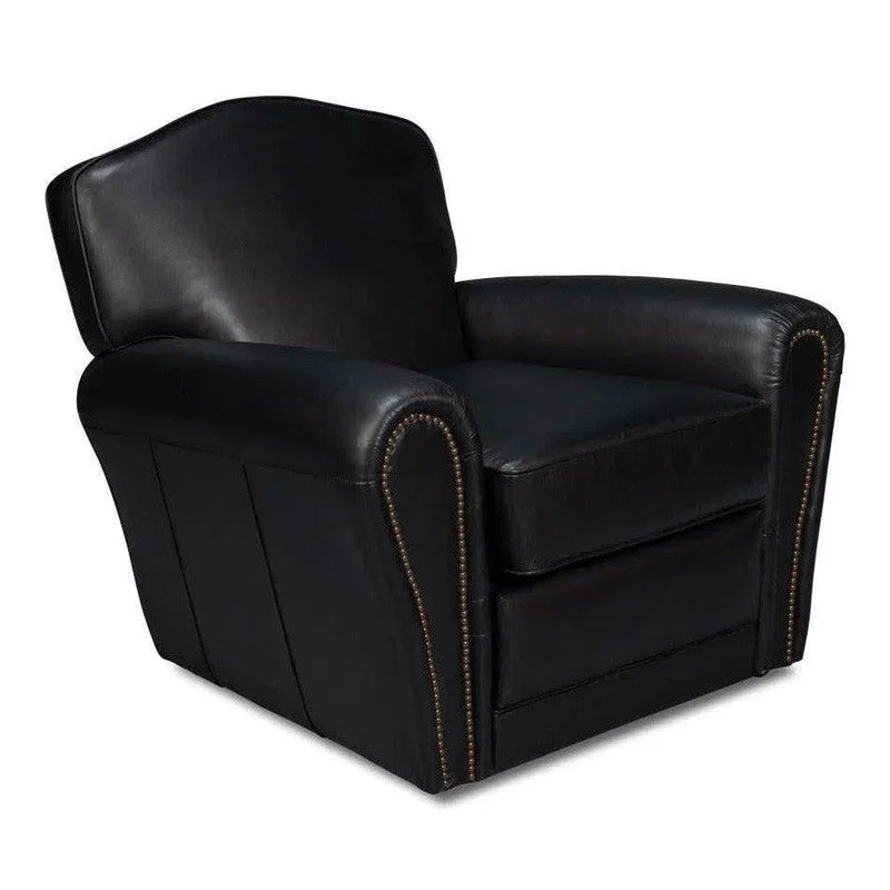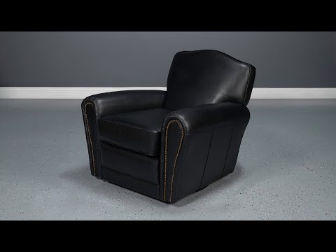 Elite is a classic Paris flea market find made current with scale and a swivel mechanism. Covered in top grain Onyx Black leather and accented with brass nail heads, Elite is the perfect addition in any room as a single seat or in pairs. Experience the luxury of Parisian design with Elite Metal and Leather Black French Club Swivel Arm Chair. Boasting a sleek scale and a convenient swivel mechanism, this arm chair is designed to elevate any room's aesthetic. Hand-crafted from premium Onyx Black leather and adorned with elegant brass nail heads, Elite offers the utmost comfort and style. Whether used individually or in pairs, this arm chair is a sophisticated and versatile addition to your home decor.