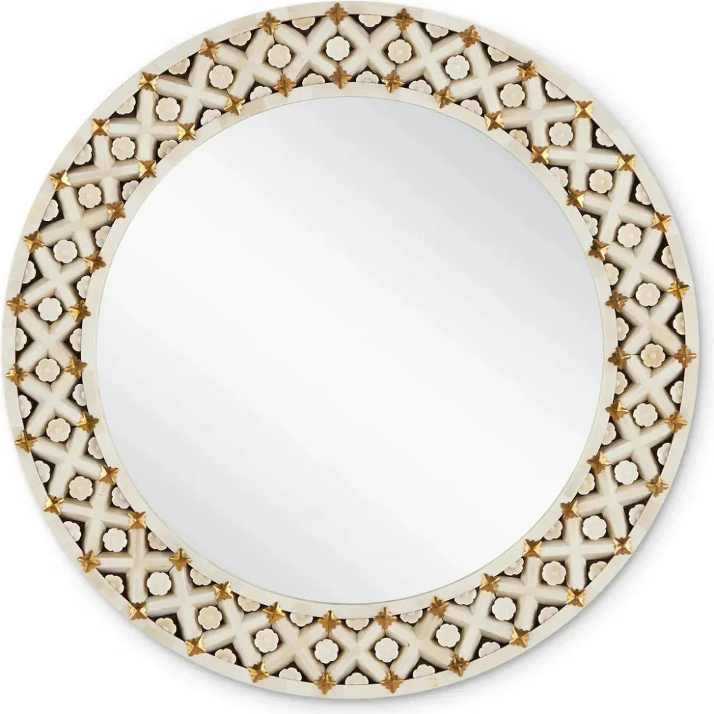 Elevate your home decor with the exquisite Ellaria Round Mirror by Currey Co. Inspired by traditional Indian design, this uniquely crafted mirror boasts texture and depth, adding a powerful punch to any space. Expertly handmade with intricate crosshatches and floral motifs in bone, this mirror exudes exotic elegance. The brass details and demanding handiwork showcase India's refined craftsmanship.