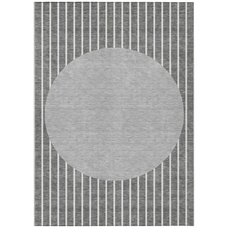 The Ember Gray Washable Rug adds a sophisticated touch to any space with its sleek vertical stripes and a unique large circle design in the center. This striking pattern creates a focal point, enhancing both style and versatility. Whether placed indoors or outdoors, this rug retains its vibrant colors and patterns thanks to its UV stabilization. The ultra-thin construction ensures no bulk underfoot, making it a seamless addition to any room. Its machine-washable fabric offers effortless cleaning, ideal for busy households that balance style and practicality.