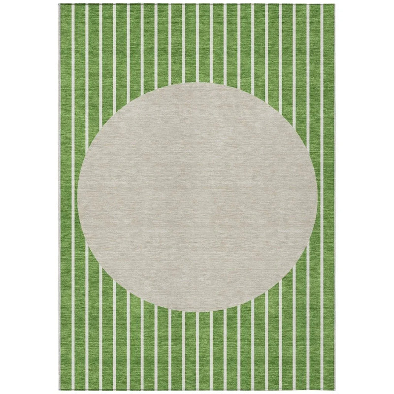 Enhance your living space with a stylish addition that offers both elegance and functionality. This transitional area rug features sleek vertical stripes and a bold circle in the center, creating a striking focal point in any room. Its design is perfect for adding a sophisticated touch to your home, while its versatility ensures it fits seamlessly into both indoor and outdoor settings. With UV stabilization, this rug maintains its vibrant green color and intricate pattern, even when exposed to sunlight.
