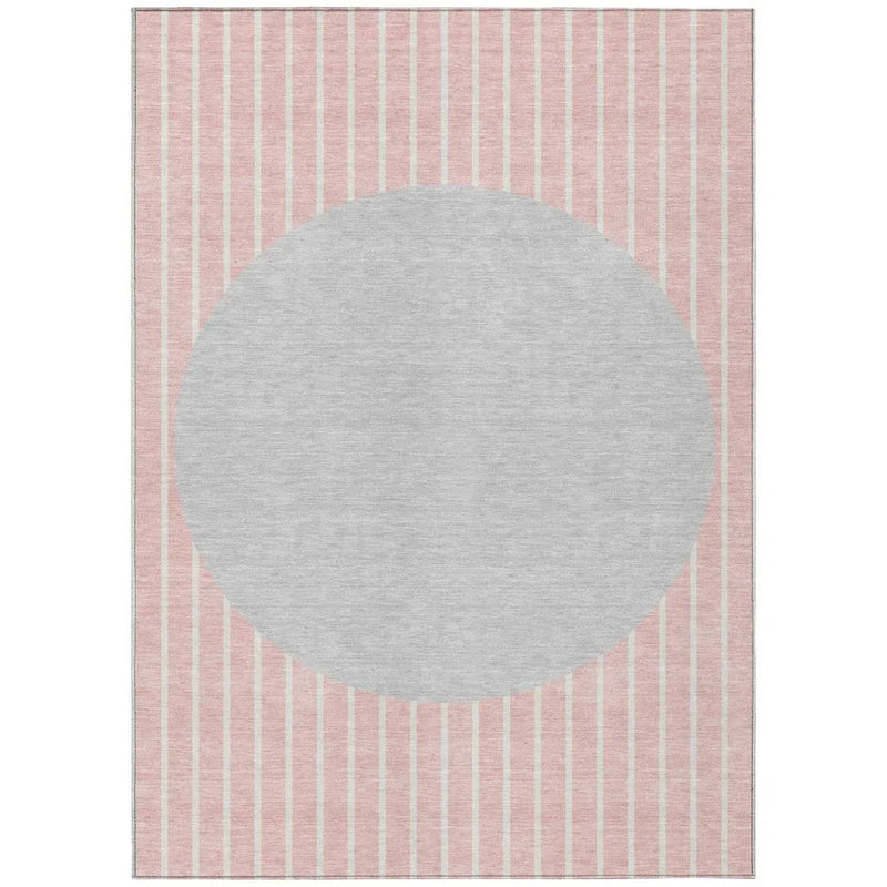 Add a touch of sophistication to your home with this transitional rug. Featuring sleek vertical stripes and a distinctive large circle in the center, it creates a striking focal point in any room. Designed with both style and versatility in mind, this rug is UV stabilized, ensuring it retains its vibrant pink hue and elegant pattern whether used indoors or outdoors. Its ultra-thin construction adds no bulk underfoot, making it an ideal choice for any space in your home. The design is tailored for active households, offering a perfect blend of practicality and elegance.