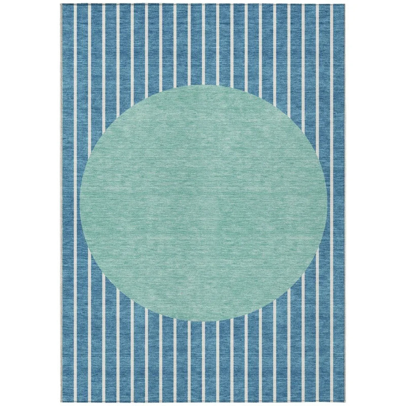 Enhance your living space with this stylish and practical addition, designed to complement both indoor and outdoor settings. The Ember Teal Washable Rug features sleek vertical stripes and a striking large circle at its center, creating a captivating focal point. Its vibrant teal color adds a touch of sophistication, while its UV-stabilized fabric ensures the rug maintains its vivid hues and unique pattern, even when exposed to the elements. This makes it a versatile choice for any room or outdoor space.