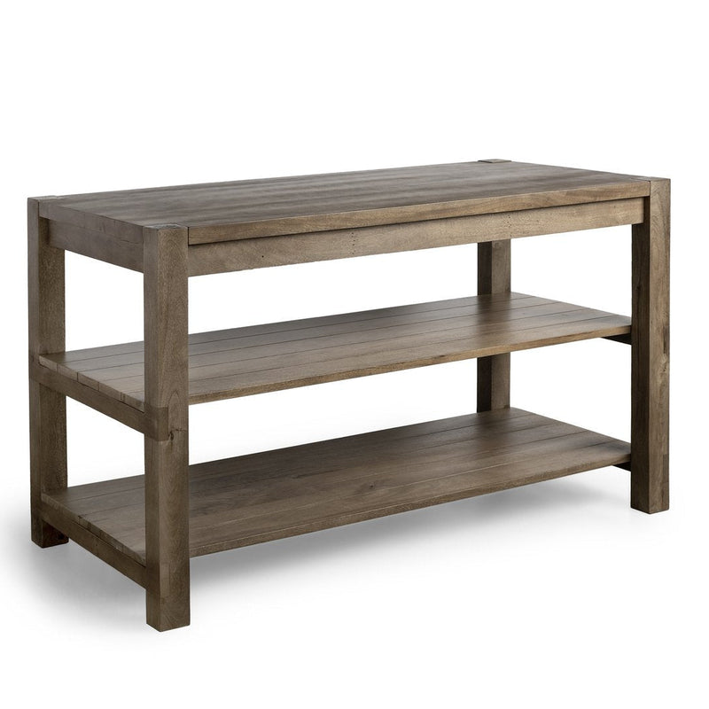 Solid wood brings a natural charm to the Emeril Kitchen Island. This island combines style and function with its smooth countertop and two extra shelves for storage. The natural brown finish highlights the wood's unique grain, adding a warm touch to your kitchen. It's made from Indian mango wood, ensuring durability and long-lasting use. The sturdy design with four solid legs provides excellent stability. Whether you're displaying your favorite dishes or storing kitchen essentials, this island has you covered. Its clean lines and sleek silhouette make it a perfect fit for modern and woodlands-inspired spaces, adding a touch of elegance to your home.