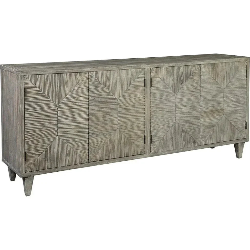 The Emory Sideboard is a beautiful blend of rustic charm and modern elegance, crafted from reclaimed elm. Its natural tones, highlighted by a soft gray wash, bring warmth and character to any room. This piece is a testament to skilled craftsmanship, featuring handcrafted joinery with unique bowtie accents. The sideboard’s sleek, rectangular shape and textured geometric pattern stand on four tapered legs, offering a sturdy and stylish foundation.
