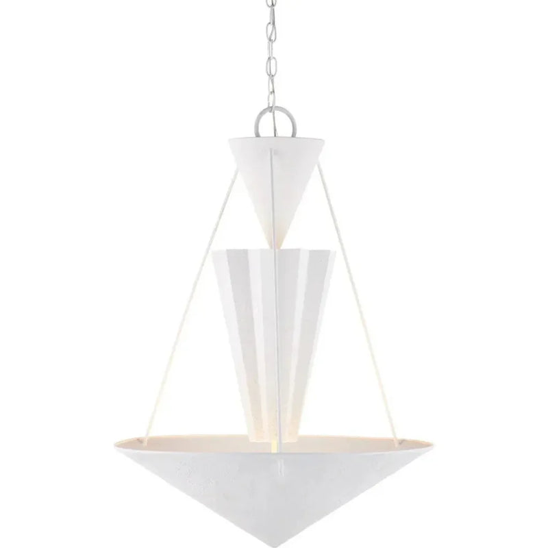 Playing with geometrical shapes that create tiers of up-light, the Empyrean Chandelier was designed with clean lines, making it as contemporary as designs come. The fluted shape of the middle shade is a design detail that brings added interest to the profile of this white chandelier. The wrought iron fixture is covered in a yeso blanco finish that creates a stippled effect to add a subtle tone-on-tone texture to the piece. Adjustable from 38.5" to 106.5" with use of included chain/rod kit/cable. If your space calls for a longer drop, additional chain/rods/cable is available for purchase.