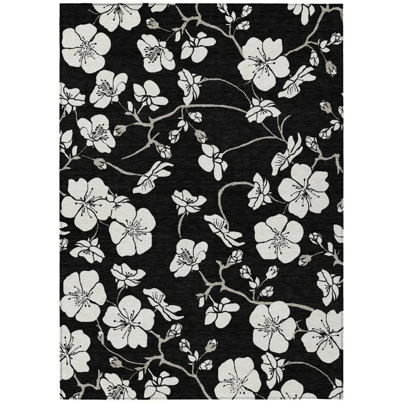 Enhance your living space with an area rug that combines elegance and practicality. The Ensa Black Washable Indoor-Outdoor Rug showcases a stunning floral pattern that adds dynamic movement to any room. Its transitional design effortlessly complements both modern and traditional settings, making it a versatile choice for various decors. The rug's UV stabilization ensures it remains vibrant, whether placed indoors or outdoors, offering long-lasting beauty under any lighting conditions.