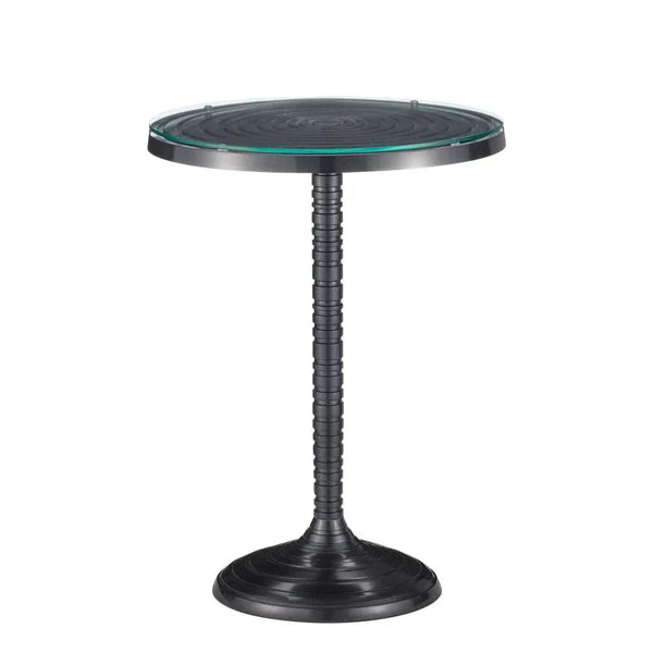 The Erno Black Accent Table is a striking piece of furniture that brings a touch of modern elegance to any room. Crafted from cast aluminum, it features a unique turned column with an industrial design that resembles a gear. The table is finished in a sleek black nickel color, enhancing its sophisticated look. Its top is made of glass, which adds a layer of refinement while complementing the bold design. This table brings a contemporary style to your home, making it a perfect fit for any modern Decor.