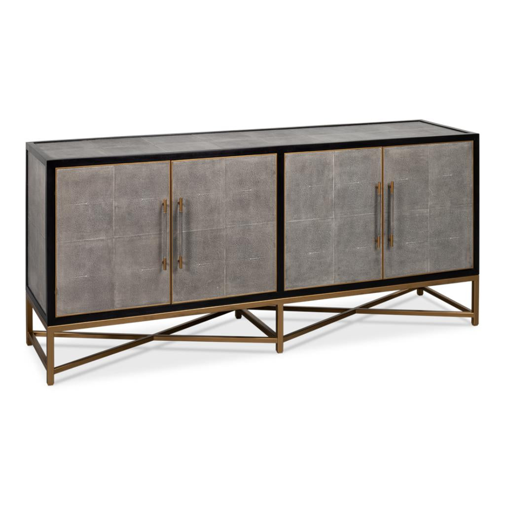 Wood and iron come together beautifully in this Exavier Four Door Sideboard, giving it a contemporary look that stands out in any room. The leather accents on the doors add a touch of elegance, making it not just a piece of furniture but a statement piece. With four spacious doors, you’ll have ample storage space to keep your essentials organized and out of sight. Its dramatic base adds a unique flair, ensuring the sideboard is as much a conversation starter as it is functional. Finished in an antique grey, it blends seamlessly with various decor styles, making it versatile for any home setting.