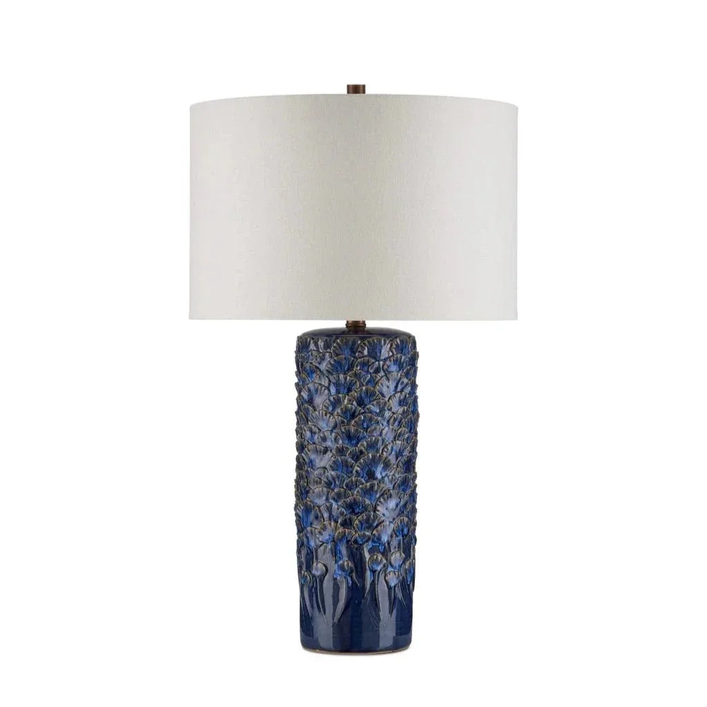 Standing at 28.5 inches tall with a 17-inch diameter, this lamp is a striking addition to your decor. The deep blue color is complemented by a beige fabric shade, which softens the light and creates a warm, inviting atmosphere. Perfect for living rooms, bedrooms, or offices, this lamp not only illuminates your space but also adds a decorative touch with its nature-inspired design. Its sturdy ceramic build ensures durability, making it a lasting fixture in your home.