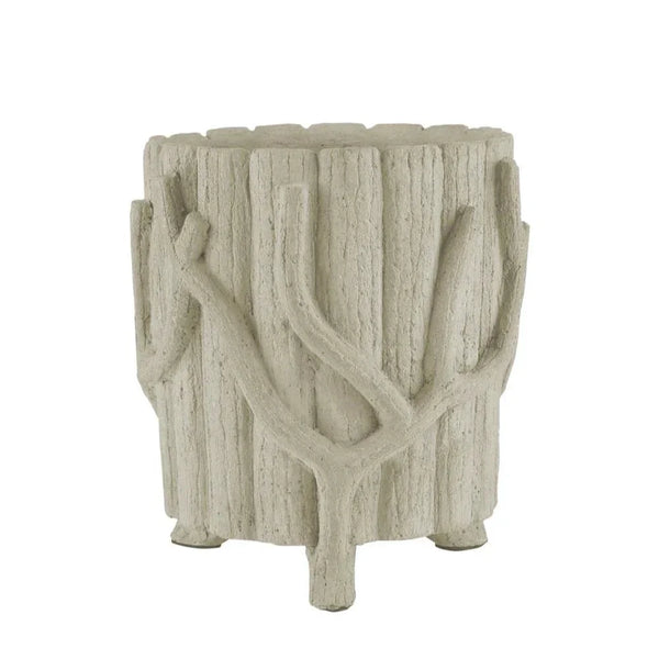 The Faux Bois Concrete Planters, available in medium-sized cylindrical, add a touch of natural elegance and rustic charm to any indoor or outdoor space. Made from concrete and iron, these handcrafted pieces feature intricate twig-like details that imitate the appearance of aged wood. The medium-sized cylindrical planter boasts a textured Portland finish with a gray hue and a branch-inspired design, making it a striking addition to gardens or patios.