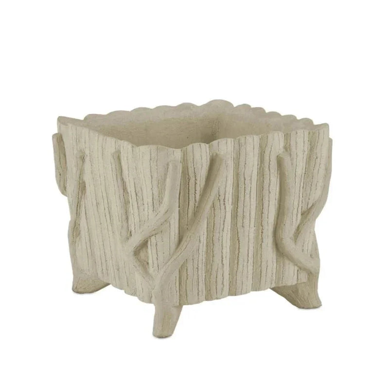 The Faux Bois Concrete Planters, bring nature-inspired elegance and rustic charm to any indoor or outdoor space. Crafted from concrete and iron, these artisan-crafted pieces feature intricate twig-like details that replicate the look of aged wood. complemented by its branch-inspired design, making it a standout addition to gardens or patios. The square planter, with its flowy ribbed surface, scalloped rim, and four short legs, exudes sophistication and stability while enhancing the natural beauty of your plants.