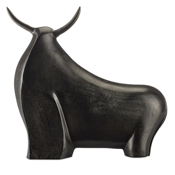 The Ferdinand Bull sculpture is made from a lost-wax technique when boiling aluminum is poured into a mold covering an original wax sculpture that melts away. Once set, there is a very long process of refining the metal to give it patina. This black sculpture is large in scale so it will be a statement piece in a space. Not only does the flowing shape of the bull's body and the whimsical angling of the horns make this a special accessory, the fact that the surface has a light texture does as well.