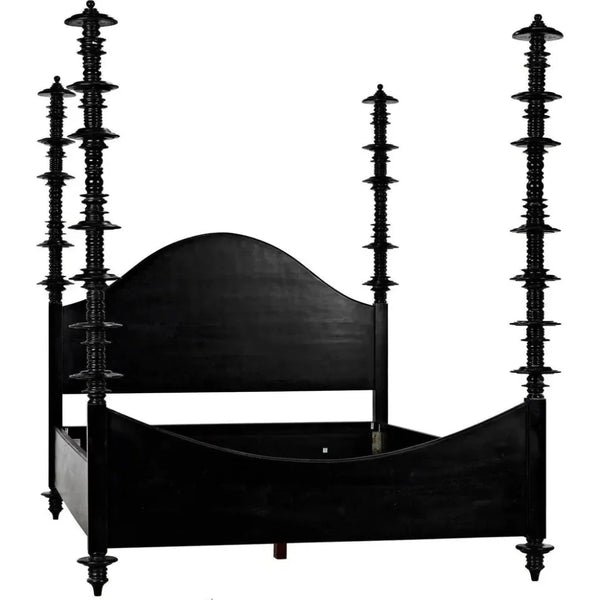 Showcase your regal style with our Ferret Wood Black Bed Frame. Hand-carved from pale, weathered, or hand-rubbed black mahogany, this bed exudes elegance. Intricate variegated discs embellish each of its four posts, creating a one-of-a-kind piece. This hand-carved pale, weathered, whitewashed, or hand-rubbed black mahogany bed is embellished with intricate variegated mahogany discs on each of its four posts. The look is not quite antique, not quite contemporary, but something more; this is a king bed truly fit for a King! Ample space and intricate details make this bed truly regal.