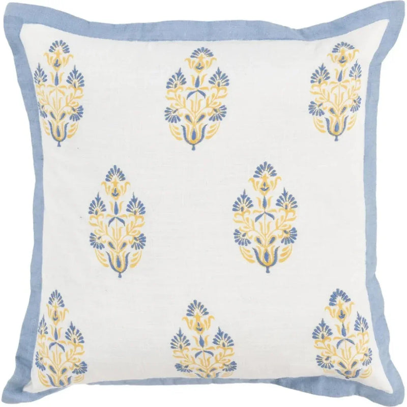 This pillow is framed with an inch light blue stitched flange. The ivory cotton slub is printed with botanical motifs in yellow. Blue accent machine embroidery embellish these motifss for a delicate vintage vibe. The back is a lighter weight solid coordianting cotton with a hidden zipper closure for ease of fill. Experience elegance and boho chic style with this gorgeous accent pillow from Rizzy Home. Made from 100% cotton, this beautiful 18”x 18” floral piece features an intricately printed floral pattern with a sky blue contrasting flange that elegantly frames the embroidered accents against a slightly textured cotton slub canvas in ivory. This pillow is a work of art that will create a compelling style statement with effortless sophistication in any refined, modern industrial décor.