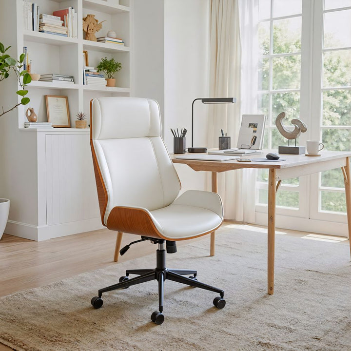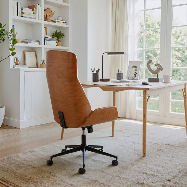 The Flex High Back Office Chair is a modern and stylish addition to any office setup. Crafted with the finest materials, including high-quality vinyl, plywood, and powder-coated steel, it offers durability and comfort. The chair's sleek black design complements any décor, making it both a functional and aesthetic piece. With adjustable height and wheels for easy mobility, this chair provides the flexibility needed for a productive work environment. Its faux leather finish adds a touch of elegance, while the ergonomic design ensures comfort during long working hours. Enhance your office space with this versatile and chic office chair.
