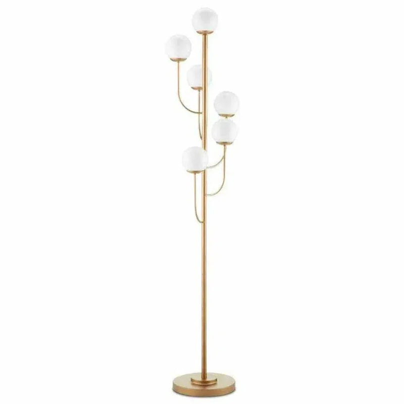 Introducing the Brass Farnsworth Floor Lamp - a visual masterpiece that embodies elegance and sophistication. Crafted with a bronze finish and six opaque white glass globes, its mid-century modern design exudes timeless charm. Let this statement piece infuse your space with a touch of artistic flair.
