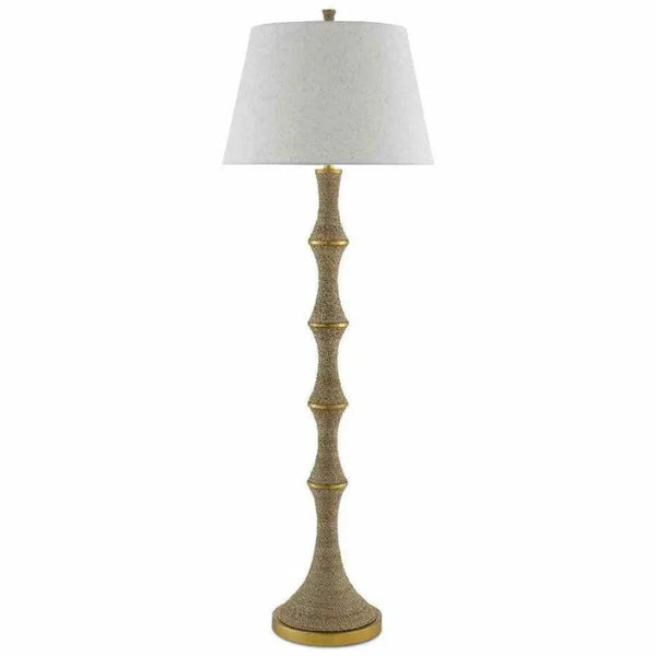 An intermingling of materials brings the Bourgeon Floor Lamp its sophistication. Wrapped in Abaca rope, the matte sections along the stem are divided by metal circlets in a dark contemporary gold leaf finish that gleam when light strikes them. We've topped this tan floor lamp with a beige poplin cotton shade.