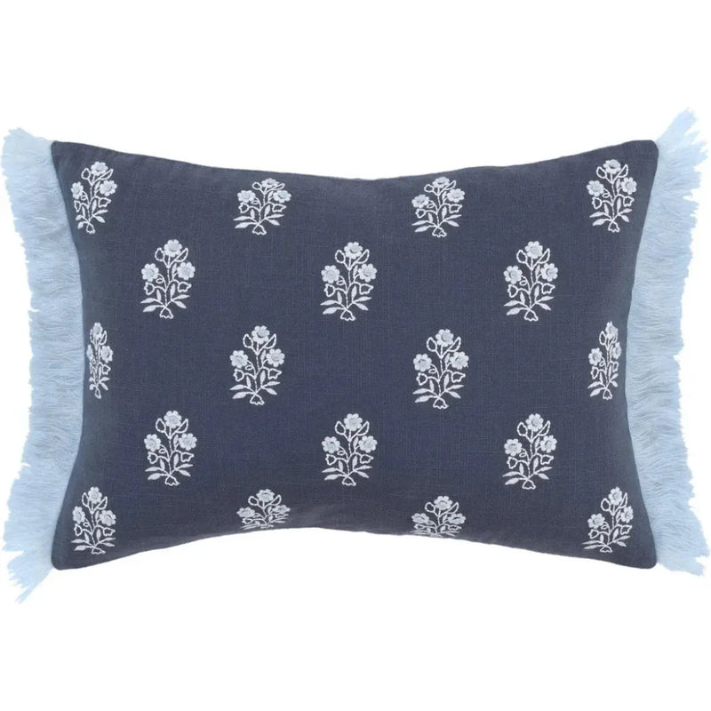 This pillow features embroidered floral motifs. Each delicate blossom sports a hand tied French knot center. The ends of this pillow feature a coordinated light blue luxurious eyelash fringe. These delicate blooms would make a delightful addition to any decor where just a spot of softness in form is needed. this pillow features a solid coordinating cotton back with a hidden zipper closure for ease if fill. This beautiful Rizzy Home accent pillow is a one of a kind home décor piece, crafted with superior materials and a design style all its own. Made of 100% cotton fabric, this pillow measures 14"x 20", and features an ornate, floral-inspired design with intricate, hand-embroidered floral motifs and French knot bloom centers, giving it a timeless vintage chic appeal. The accent pillow has a bold color combination, with navy blue and indigo hues, along with teal eyelash fringe on each end and coordinating solid cotton back with a hidden zipper closure for ease of fill and cleaning. Perfect for adding a touch of character to any space, this gorgeous Rizzy Home accent pillow is sure to make a statement of personal style in any room.