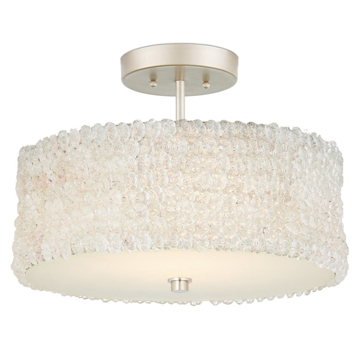 Individually hand-pinned clear glass flowers comprise the shade of the Florecitas Chandelier. The illumination of the three-light fixture is filtered through an acrylic diffuser to create a soft glow. The white chandelier is convertible so it can be mounted as a semi-flush or fitted to a chain to transform it into a pendant. The Florecitas is dimmable.