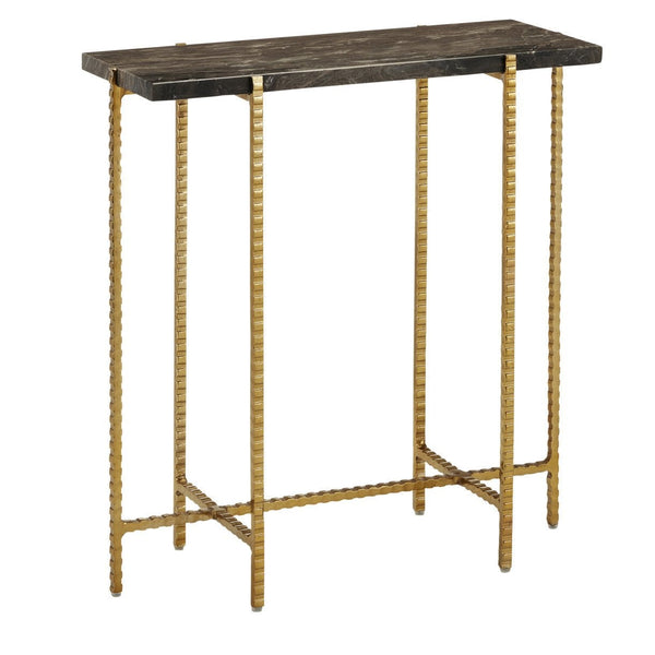 Gold iron and cappuccino-colored stone come together to create the Flying Marble Gold Side Table. The X-shaped stretchers and top support are as toothy as the legs to bring this gold accent table an industrial vibe, but it is also a shoe-in for a contemporary aesthetic. Design details of note are the way the feet swell and the clever way the legs culminate to embrace the brown marble top.
