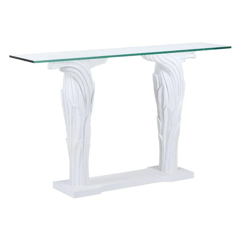 The Fontana Flair Console, crafted by Meg Braff for Wildwood, is a perfect addition to any entryway, hallway, or living area. This piece provides an elegant platform for showcasing your favorite accents and lighting. Its design is inspired by the intricate details of a bubbling fountain, bringing a touch of sophistication to your home. The console is made with a sturdy wooden base, topped with a clear glass surface, offering both durability and style. Its white and cream color palette complements a wide range of interior designs, making it a versatile choice for any decor. This console is not just about looks; it offers practical functionality for everyday use.
