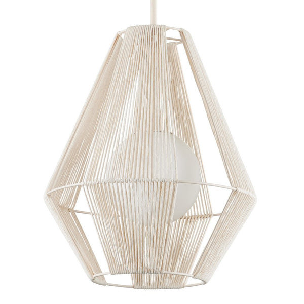 With its sleek mid-century modern lines, the Fraxel Pendant is a stylish addition to any room. The light is made from bleached Kraft paper twine, double-wrapped around a sturdy wrought iron frame. The vanilla finish of the frame adds a subtle touch, enhancing the texture and design of the twine. This pendant light has a geometric shape that flares out to 17 inches in diameter, making it an eye-catching centerpiece.