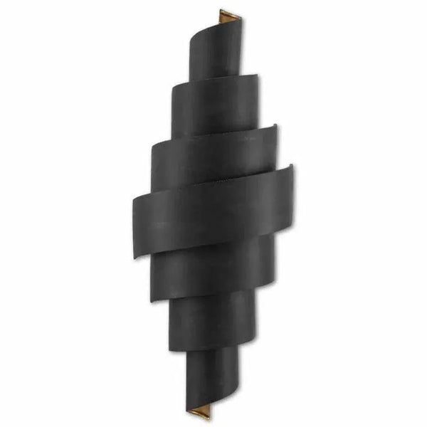 The Chiffonade Wall Sconce has an elegant fluidity to its lines that curl downward to end with a lovely swirl. Made of wrought iron in an antique black finish, the black sconce has a contemporary gold finish on the interior of the shade that brings a warm glow to its illumination.