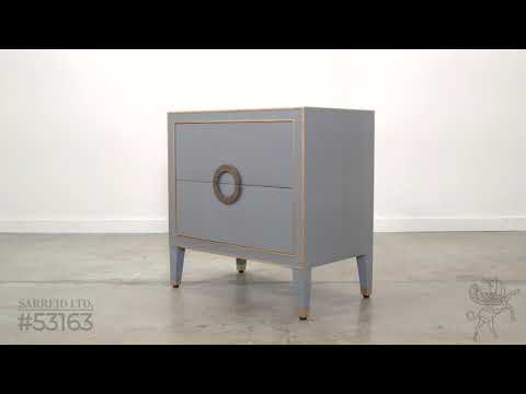 The Gabriella Night Stand in Storm Grey with Gold Accents brings a touch of elegance and style to any bedroom décor. Crafted from high-quality MDF, this nightstand is fully wrapped in a light grey shagreen leather, providing a textured and sophisticated finish. Gold leather piping adds a luxurious touch, while the iron drawer pulls and feet caps boast an old gold finish, enhancing the overall appeal. The transitional style seamlessly fits into both contemporary and classic settings, making it a versatile piece for any home.