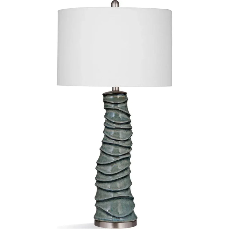 The Gallie Table Lamp is crafted of ceramic with a white drum shade. Finish: blue crackle. Material: ceramic. Wattage: 100W Max. Bulb Type: A. Socket Type: E26. The hand crafted details produced by a skilled artist lends itself to a unique technique and will vary slightly. Experience the thrill of owning a one-of-a-kind masterpiece!